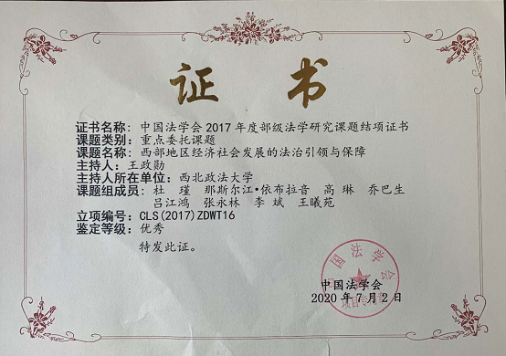 由bat365官网王政勋教授主持的中国法学会重点委托课题——西部地区经济社会发展的法治引领与保障【CLS(2017)ZDWT16】,顺利结项,鉴定等级为优秀。