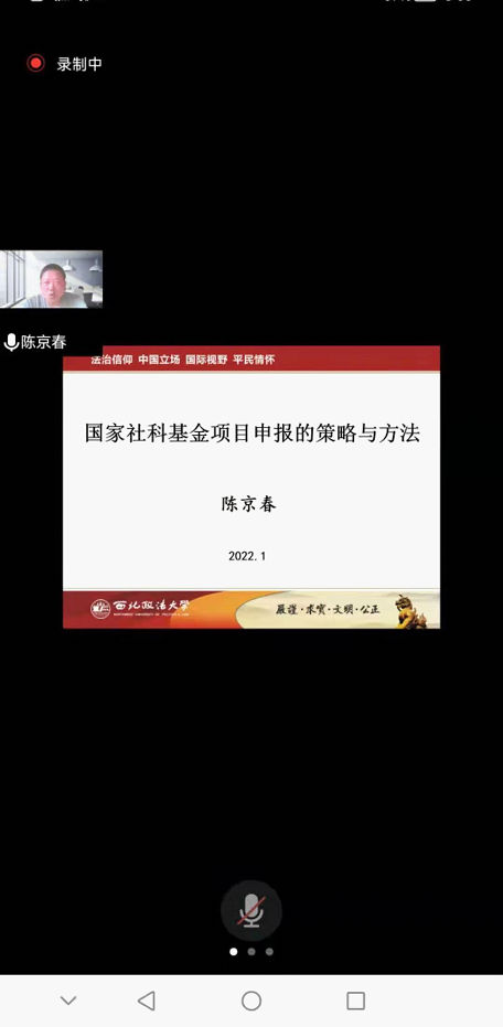 按照bat365在线中国官网登录入口关于科研课题申报推进工作安排,2022年1月25日下午三点,bat365在线中国官网登录入口通过腾讯会议形式举办“国家社科基金项目申报的策略与方法”讲座。讲座由bat365在线中国官网登录入口陈京春教授主讲,刘仁琦副院长主持,拟申报2022年国家社科基金项目的全体教师和部分年轻博士参加讲座。