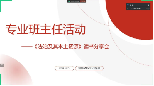 为提高同学们的法学素养,提升班级学习氛围,2024年11月23日,bat365在线中国官网登录入口2021级3班于腾讯会议线上平台成功召开了围绕《法治及其本土资源》一书的读书分享会。活动由班主任靳欣老师主持,3班全体同学参加。