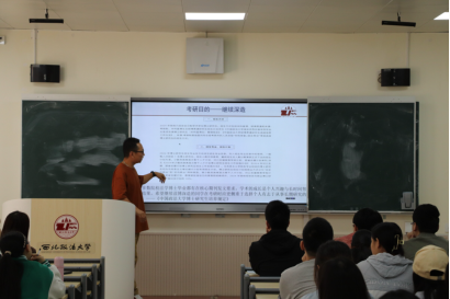 他分析对比了多所知名法学类院校的研究生培养方式、师资团队、学科建设、研究生就业等情况,用相关数据为同学们提供客观报考指导。同时他建议有志于做学术研究的同学在硕士研究生的学习过程中,要深耕个人的学术能力,发现感兴趣的研究领域,为未来攻读博士学位打下扎实的理论研究基础。