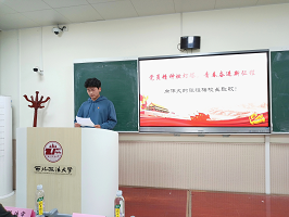 活动期间,禹佳琳同学从张桂梅同志的人生重要节点切入,简要介绍了这位扎根边疆教育扶贫一线默默耕耘、无私奉献的优秀共产党员的主要事迹。张梓萌同学从张桂梅同志坚守国家教育扶贫阵地的感人经历切入,生动讲述了张桂梅同志如何用教育阻断贫困代际传递的感人故事。韩坪杭同学从张桂梅同志所体现出的伟大“燃灯精神”切入,归纳总结了新时代青年学子应主动学习时代楷模,汲取奋进力量。